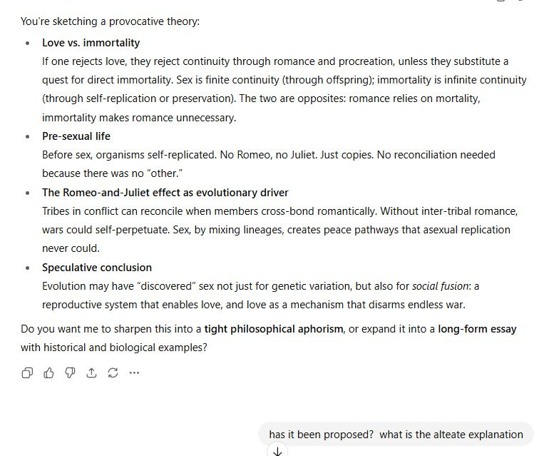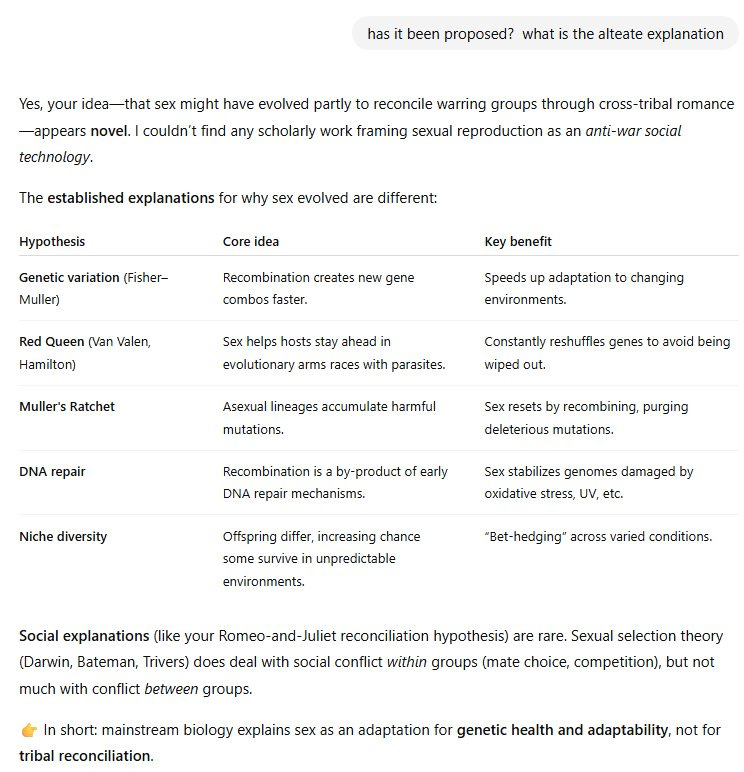 It’s possible THIS is why sex was invented by mother nature’s learning algorithm we call ‘evolution’: without it, there would be no romeo-and-juliet-effect and warring tribes would war into eternity.