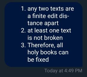 If this is unclear review Edit Distance in Computer Science. I should also say that, due to the books being finite and thus containing at most a finite number of errors, these edits are not just logically possible, but physically possible — even if the edits, for them to stick, must be made by specific players at specific times.